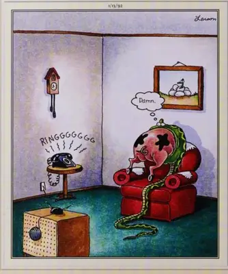 В это время Удалить страницу's Mobiltelefoner var en undtagelse og ikke standarden for opsigelse. På den anden side var de faste linjer allestedsnærværende, og et almindeligt fænomen i de faste perioder var følelsen af telefonen, hver gang jeg satte mig. Gary Larson tilbyder en perfekt rysten om denne idé i denne tegneserie. Змея принимает телефон к телевидению и свинине, лежа в стуле, пока не распространится во рту.