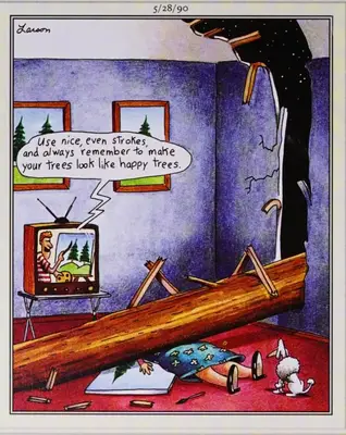 Z Удалить страницу Мультфильм Гэри Ларсона использует иронию, чтобы изменить комедийную трагедию. Панель означает упавшее дерево. Разбейте края дома и сдавите женщин в гостиной. Счастливых трое 。 ''