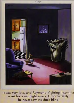 Nors tai gali būti ančių pusiau automatinė buveinė, „Larson“ animaciniai filmai teigia, kad medžiotojai gali patekti į panašius gyvenamuosius kambarius. Bairiai pilka, kad vyras, paslėptas kito žmogaus namų šešėlyje, yra paslėptas kažkieno atspalvyje, tačiau medžiotojams ir jo maistui, daugumai žmonių, niekada daugiau negalvoja. Tačiau Larsonas turi labai išsamią šios temos idėją, kuri šiuo atveju atrodo klasikinė. Удалить страницу Полосы.